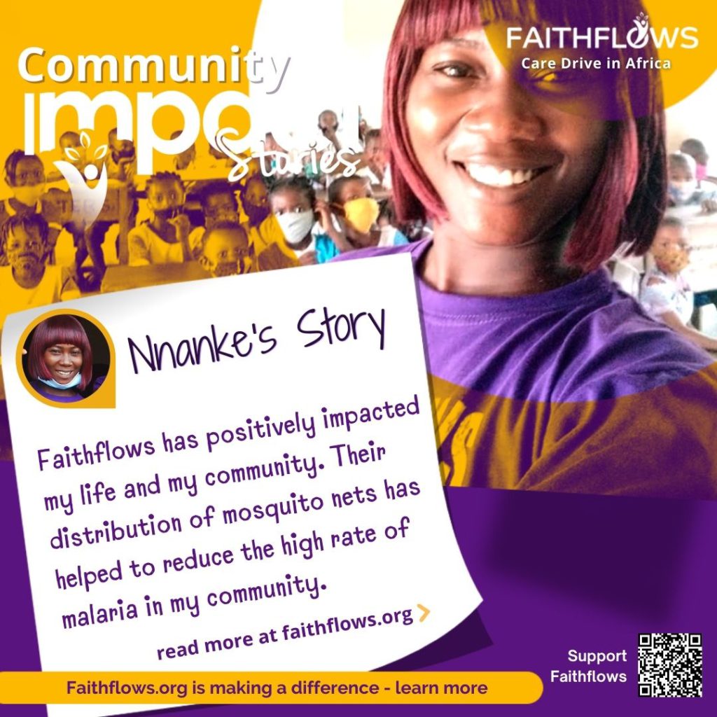 In terms of Faithflows’ impact in my community, my community was extremely lucky to have been reached out to during the Covid-19 pandemic and I must say with the little act of kindness by Faithflows on my community’s health facility, improved people’s health and reduced the high rate of malaria with the distribution of mosquito nets. We also visited orphanages and the children were overwhelmed with joy… The smiles on the faces of people whose lives have been touched and the togetherness of faithflows family (chapter members) were achieved all because of Faithflows!!!. Thank you @Faithflows for all you do and God bless the community real good!!!